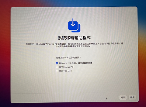 第5步,在新Mac開啟「系統移轉輔助程式」,選擇「從 Mac、時光機備份或啟動磁碟」的傳送選項